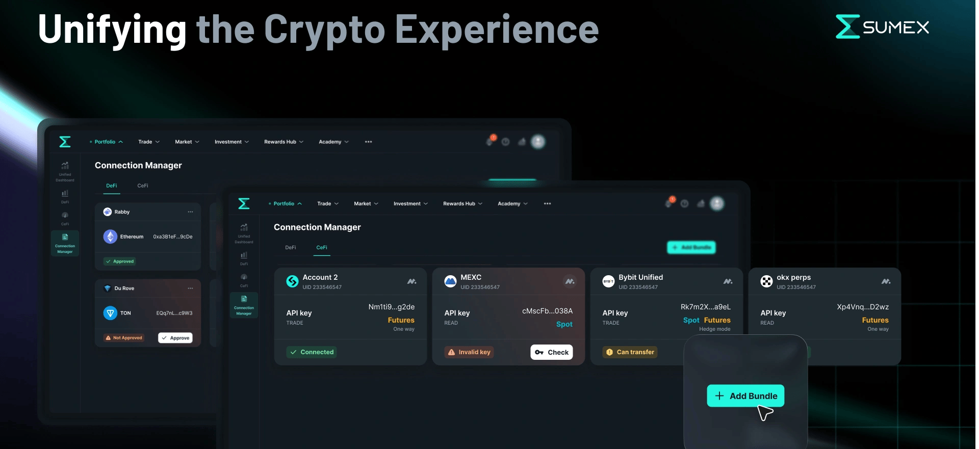 Sumex는 일반적으로 고립되어 있는 CeFi와 DeFi 세계 사이의 간극을 메우는 Web3 애그리게이터로 포지셔닝되어 있습니다. 플랫폼의 핵심 설계는 사용자가 기존의 중앙화 거래소(CEX) 계정과 비수탁형 Web3 지갑을 연결할 수 있도록 하여, 서비스가 사용자 자산을 수탁하지 않고도 통합된 포트폴리오 관리와 교차 플랫폼 활동을 가능하게 합니다.