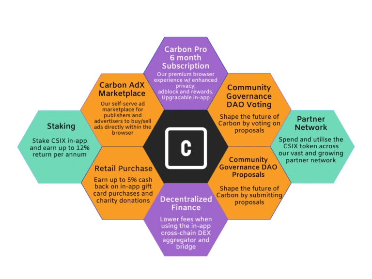 CSIX 代币是 Carbon 的原生 实用代币,构建在 BNB 智能链 (BSC) 上。该代币采用放弃的 智能合约 设计,确保永远无法 铸造 额外的代币。大约 3 亿个 CSIX 代币(几乎占总供应量的三分之一)将由社区治理 DAO 管理,该 DAO 将作为 Web 应用程序启动。通过此 DAO,代币持有者可以对关键的生态系统决策(如 代币销毁、上市、排放计划和营销计划)提出建议并进行投票。剩余的代币分配到不同的领域,大部分受四年归属期的限制,并保留供将来需要时使用。[8] [11]