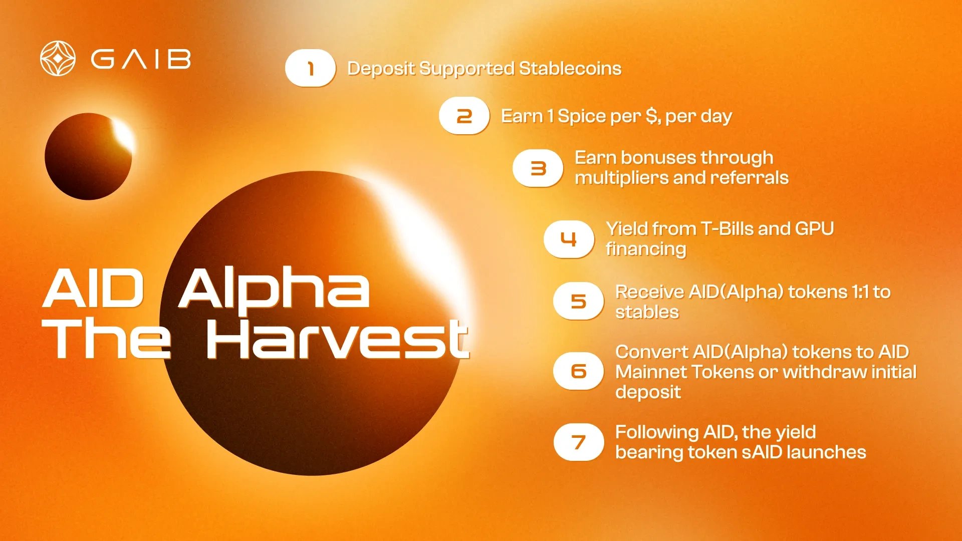 The AID Alpha program, marketed as "The Spice Harvest," serves as a liquidity bootstrapping phase. Participants deposit stablecoins like USDC and receive AIDAUSDC tokens on a 1:1 basis. These receipt tokens are liquid, transferable, and accrue "Spice," a points-based reward intended to determine future benefits upon the project's official token launch. The program incentivizes early participation through a tiered multiplier system for Spice points. The long-term vision of the GAIB project is to establish a new asset class by tokenizing GPUs and their future cash flows, creating a tradable market for AI compute power.