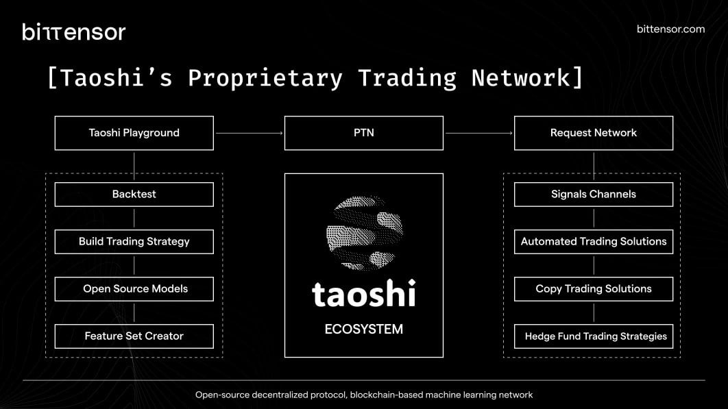 Taoshi is a software company that specializes in developing decentralized trading infrastructure on the Bittensor blockchain. The company's core product is the Proprietary Trading Network (PTN), a system that integrates artificial intelligence and machine learning to foster a competitive environment where traders are rewarded based on performance. [1]