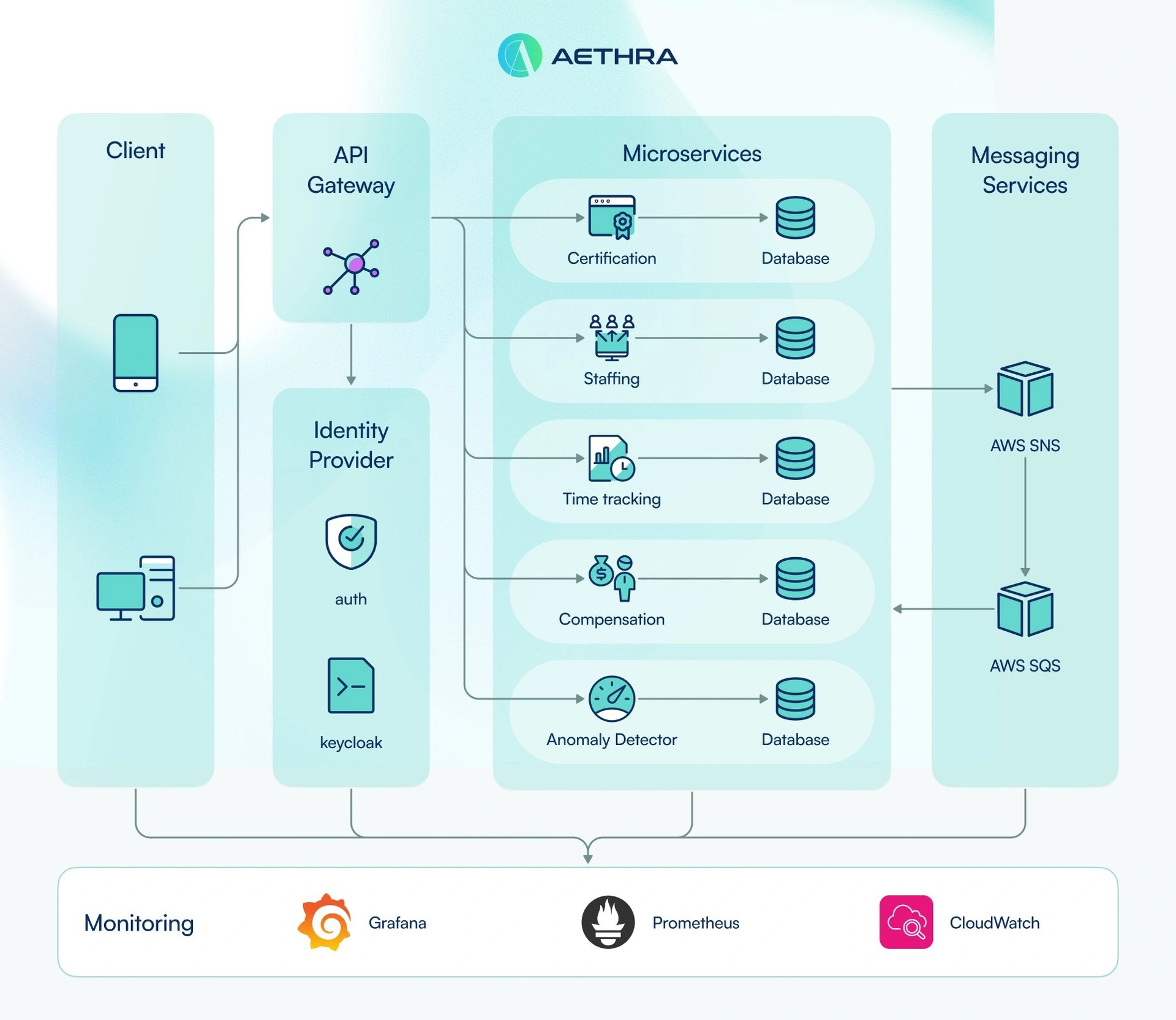 The backend is structured as a microservices architecture, where the system is composed of small, independent services, each responsible for a specific domain like authentication or time tracking. This design allows services to operate and be scaled independently, and each service maintains its own isolated database. Communication between these services is event-driven, using AWS Simple Notification Service (SNS) to broadcast events and AWS Simple Queue Service (SQS) to deliver them. This loosely coupled design enhances reliability and scalability. The platform's DevOps practices include hosting on AWS with containerized deployments, automated CI/CD pipelines for builds and testing, and real-time monitoring to ensure uptime. [8]