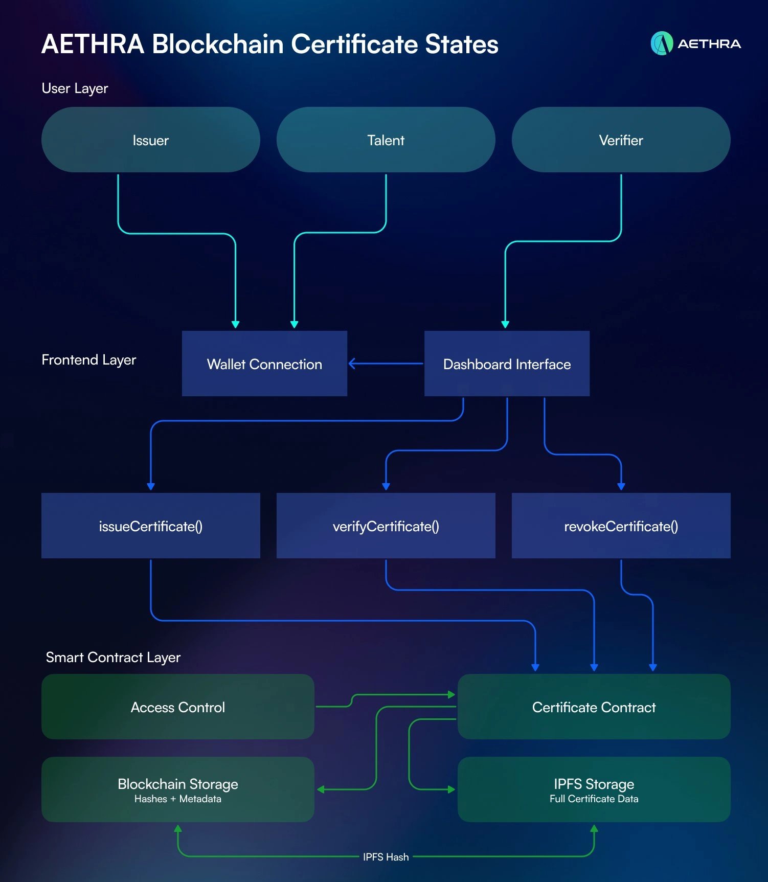 Aethra AI is built on the Ethereum blockchain and employs a hybrid architecture that combines off-chain computation with on-chain verification. The AI component, which handles computationally intensive tasks such as role matching, resource planning, and predictive analytics, operates off-chain. This design choice prevents the high costs and low throughput associated with performing complex computations directly on the Ethereum network. [1][2]