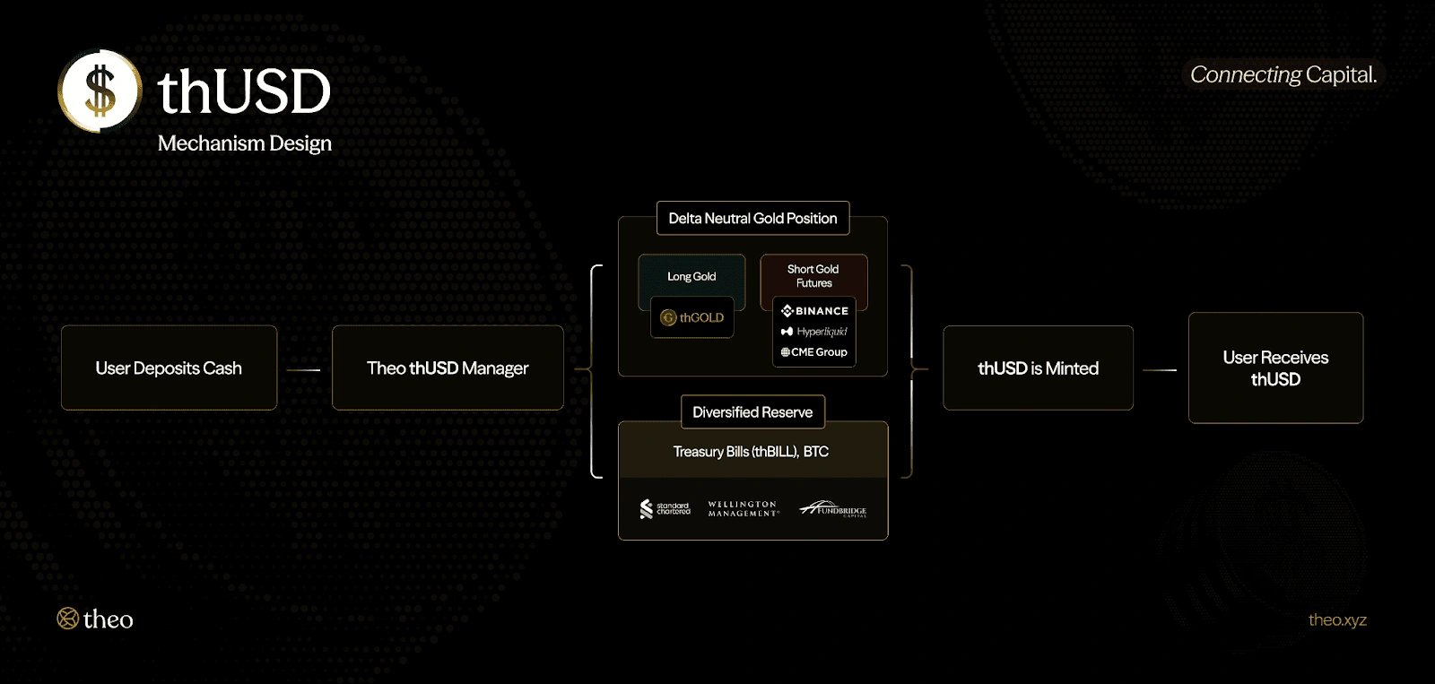 thUSD 是一种计息 稳定币,旨在将美元稳定性与作为生产性资产的黄金敞口相结合。它主要通过 thGOLD 进行抵押,thGOLD 是一种代币化的计息黄金产品,通过向成熟零售商出借黄金产生利息,同时通过使用黄金期货的 Delta 中性头寸对冲黄金价格风险。额外的支持来自多样化的现金等价物现实世界资产(包括 thBILL)和其他 数字资产,形成了一个旨在维持稳定并最大化回报的分层结构。该 稳定币 的结构旨在提供来自两个独立来源的收益——来自 thGOLD 的借贷利息和来自黄金期货的展期收益——即使在策略规模扩大时也能实现持续的正回报。thUSD 专为寻求以美元计价的储蓄工具的个人存款人、寻求黄金市场 Delta 中性敞口的机构参与者,以及需要可组合、可扩展 稳定币 的更广泛 DeFi 应用而设计。该策略利用 Theo 现有的基础设施(包括代币化国债产品和黄金资产),提供受监管的、链上访问计息工具的渠道。[13]